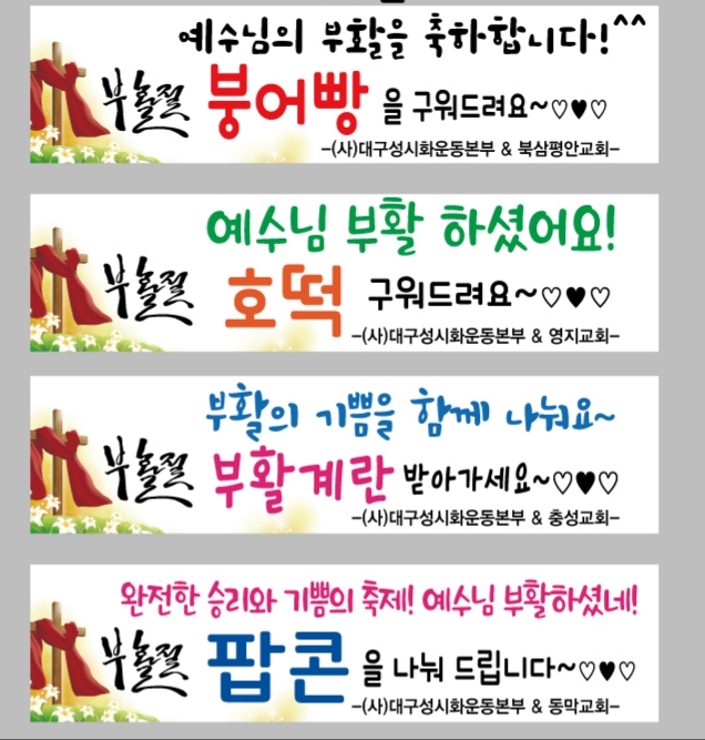 ![]() ![]() ![]() ![]() 2019년 4월 21일(주일) 오후 6시에 대구백화점앞 무대에서 부활절기념 음악회와 거리전도를 합니다. 대구시민의 0.2% 5천명에게 나눠 줄 전도지와 물티슈를 준비했습니다. 충성교회에서 부활계란 2,000개, 영지교회에서 호떡 500개, 북삼평안교회에서 붕어빵 400개를 제공합니다. 동막교회에서 팝콘과 茶를 준비했습니다. 2019 예수님의 부활을 축하하며 대구시민과 함께 하는 음악회와 거리전도에 참여해 주시기 바랍니다.